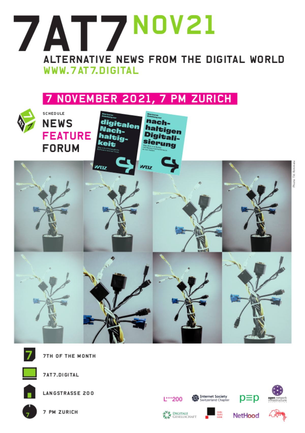 Dear all, This month's 7at7 event, on Sunday Nov 7 at 7pm, will feature a booklet on the topic of sustainability and digitalization, just published and distributed with this week's WOZ. The initial idea and first contacts were initiated at the 7at7 event of September 2020! Two of the key contributors in this process, Rahel Estermann, https://rahelestermann.ch/, and Nana Karlstetter, pEp foundation will discuss (in english) the booklet's content (in german) and future steps toward a more sustainable Internet. Moderation: Panayotis Antoniadis (NetHood) Rahel Estermann will be present physically in the L200 studio and we will experiment with a more hybrid format assuming some audience at L200. In addition, an exhibition showcasing the booklet and other related initiatives will be accessible until the end of the month. When the space is open (Mo-Fr, between 17:30 and 19:30) you can also take a free copy of the booklet, but part of it will be displayed on the L200 windows, so you can read parts of it while passing through the Langstrasse :-) Best, Panayotis Antoniadis Chair ISOC-CH